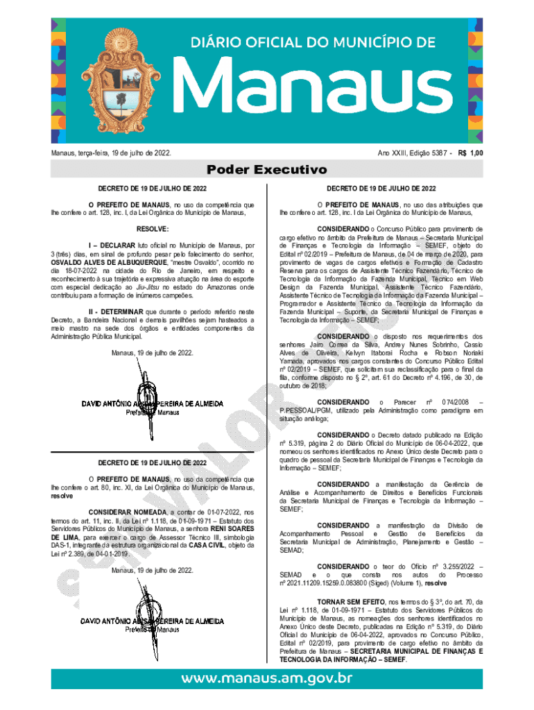 Manaus, terafarad, 19 de Julio de 2022. ANO XXIII, Edit 5387 RJ 1,00Poder Executive SECRET DE 19 DE JULIO DE 2022DECRETO DE 19 DE JULIO DE 2022O PREFECT DE MANAUS, no USO the competence Que the confer