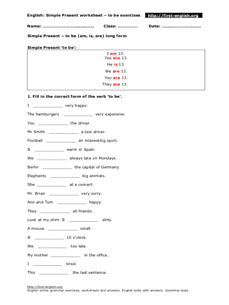 English: Simple Present worksheet to be exerciseshttp://firstenglish.ornate: ................. Date: .............. Class: Simple Present to be (am, is, are) long form Simple Present \'to be\': I