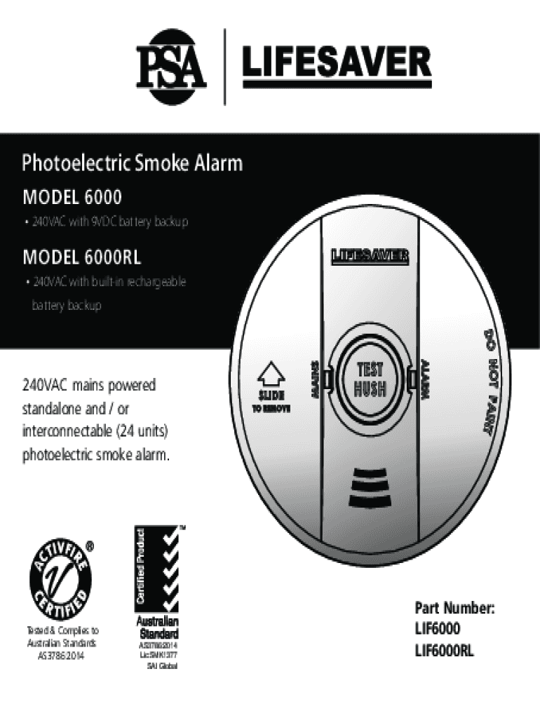Photoelectric Smoke Alarm MODEL 6000 240VAC with 9VDC battery backupMODEL 6000RL 240VAC with built-in rechargeable battery backup240VAC mains powered standalone and / or interconnectable (24 units)