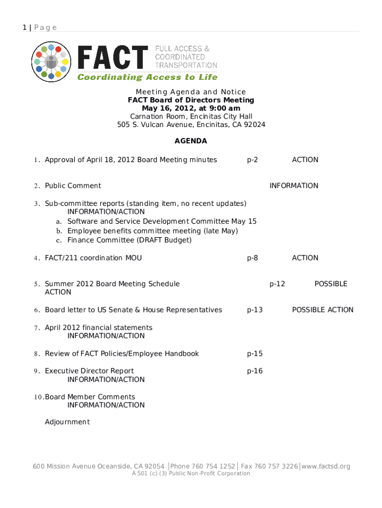 1 |Page Me eating Agenda and Notice FACT Board of Directors Meeting May 16, 2012, at 9:00 am Carnation Room, Tendinitis City Hall 505 S. Vulcan Avenue, Tendinitis, CA 92024 AGENDA 1. Approval of April