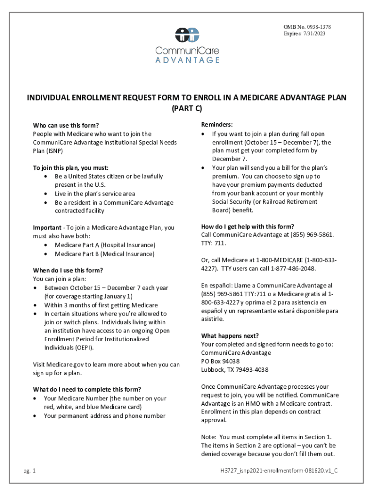 OMB No. 09381378 Expires: 7/31/2023INDIVIDUAL ENROLLMENT REQUEST FORM TO ENROLL IN A MEDICARE ADVANTAGE PLAN (PART C) Who can use this form? People with Medicare who want to join the Communicate Advantage