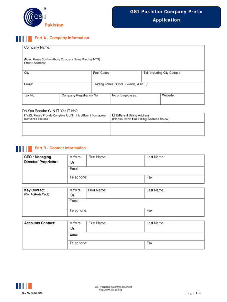 GS1 Pakistan Company Prefix ApplicationPart A Company Information Company Name: (Note: Please Confirm Above Company Name Matches NON)Street Address: City:Post Code:Email:Trading Zones (Africa, Europe,