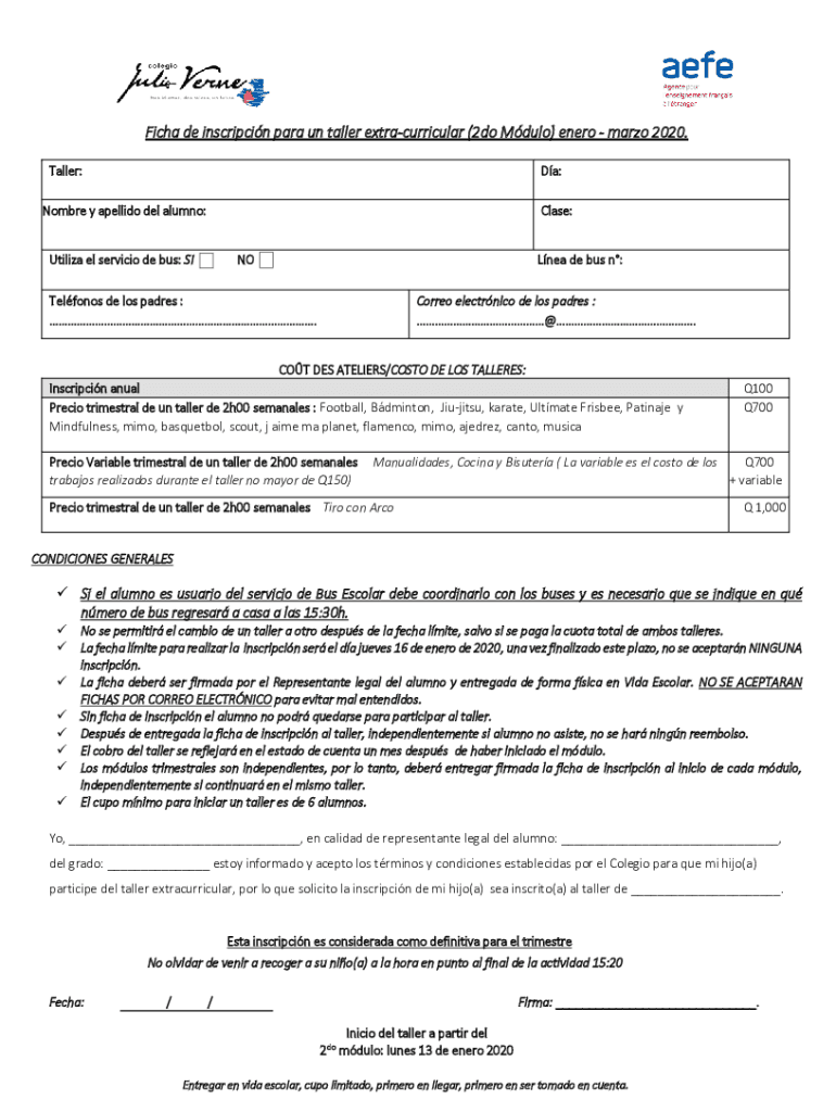 FICA de inscription para UN taller extracurricular (2do Modulo) Nero Mario 2020. Taller:The:Hombre y Adelaide Del alumni:Class:Utilize El service DE bus: Single DE bus n:Teflons de Los padres :. Core