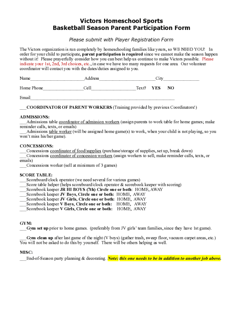 Victors Homeschool Sports Basketball Season Parent Participation Form Please submit with Player Registration Form The Victors' organization is run completely by homeschooling families like yours,