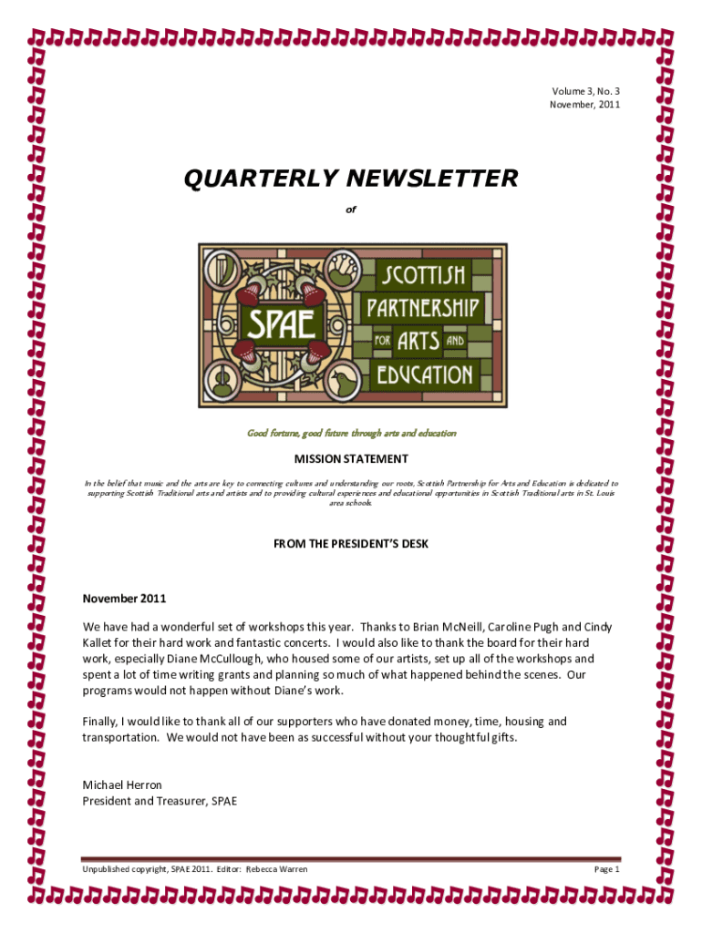 Volume 3, No. 3 November, 2011QUARTERLY NEWSLETTER Osgood fortune, good future through arts and educationMISSION STATEMENT In the belief that music and the arts are key to connecting cultures and