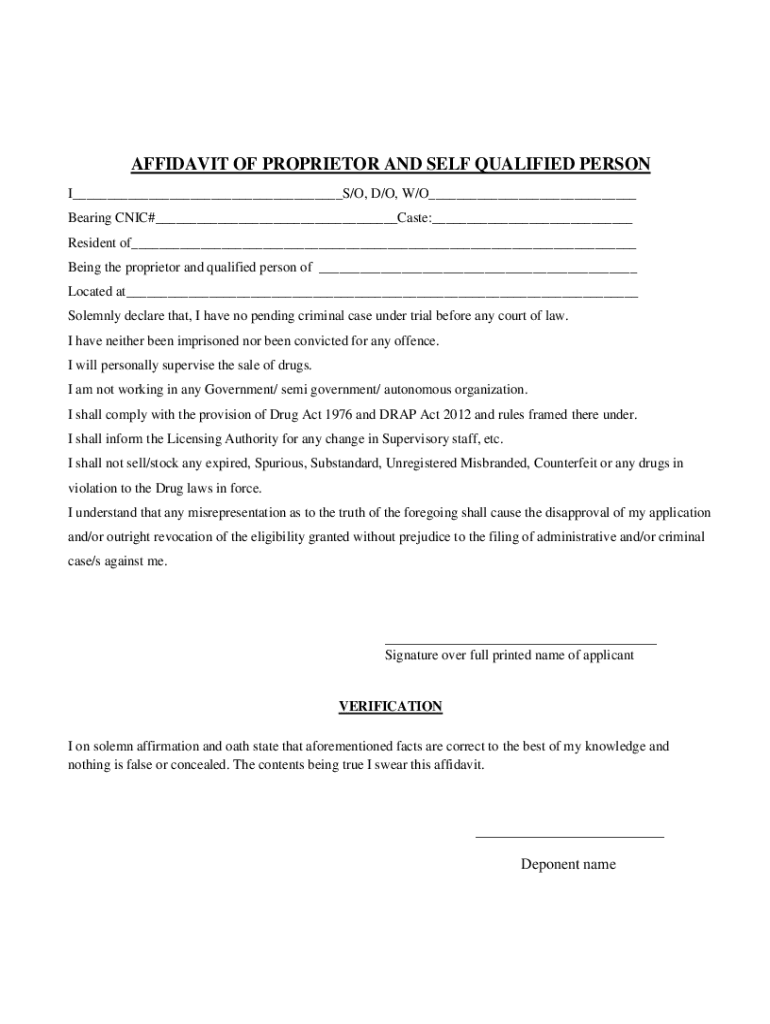 AFFIDAVIT OF PROPRIETOR AND SELF QUALIFIED PERSON I___S/O, D/O, W/O___ Bearing CNIC#___Caste:___ Resident of___ Being the proprietor and qualified person of ___ Located at___ Solemnly declare that,