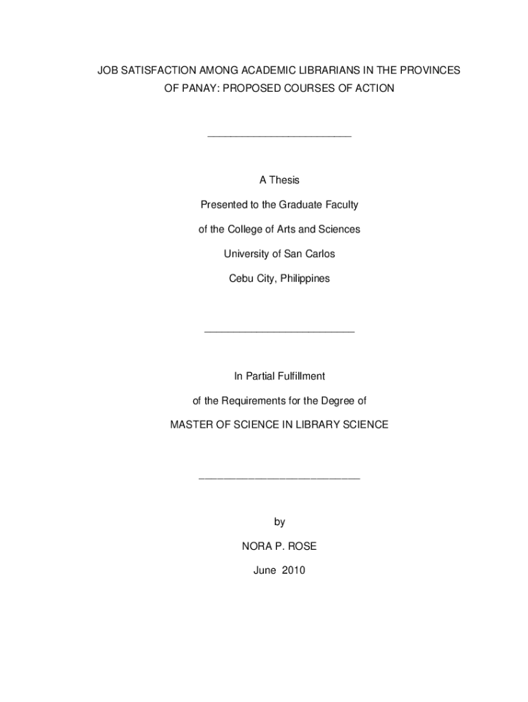 1 JOB SATISFACTION AMONG ACADEMIC LIBRARIANS IN THE PROVINCES OF PANSY: PROPOSED COURSES OF ACTION___A Thesis Presented to the Graduate Faculty of the College of Arts and Sciences University of San