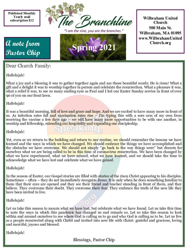 Published Monthly Yearly mail subscription $12A note from Pastor Chipping 2021Wilbraham United Church 500 Main St. Abraham, MA 01095 www.WilbrahamUnited Church. Order Church Family: Hallelujah! What