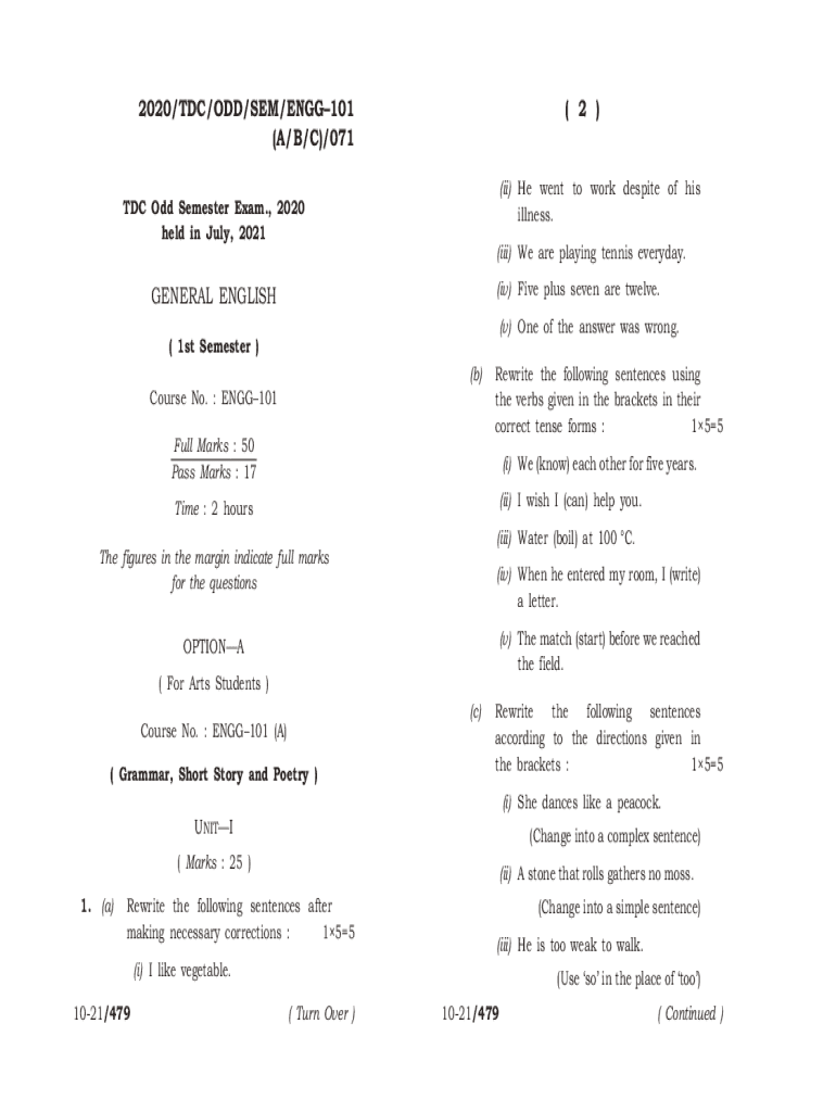 2020/TDC/ODD/SEM/ENGG101 (A/B/C)/071(2)(ii) He went to work despite his illness.TDC Odd Semester Exam., 2020 held in July 2021(iii) We are playing tennis every day. (iv) Five plus seven are twelve.