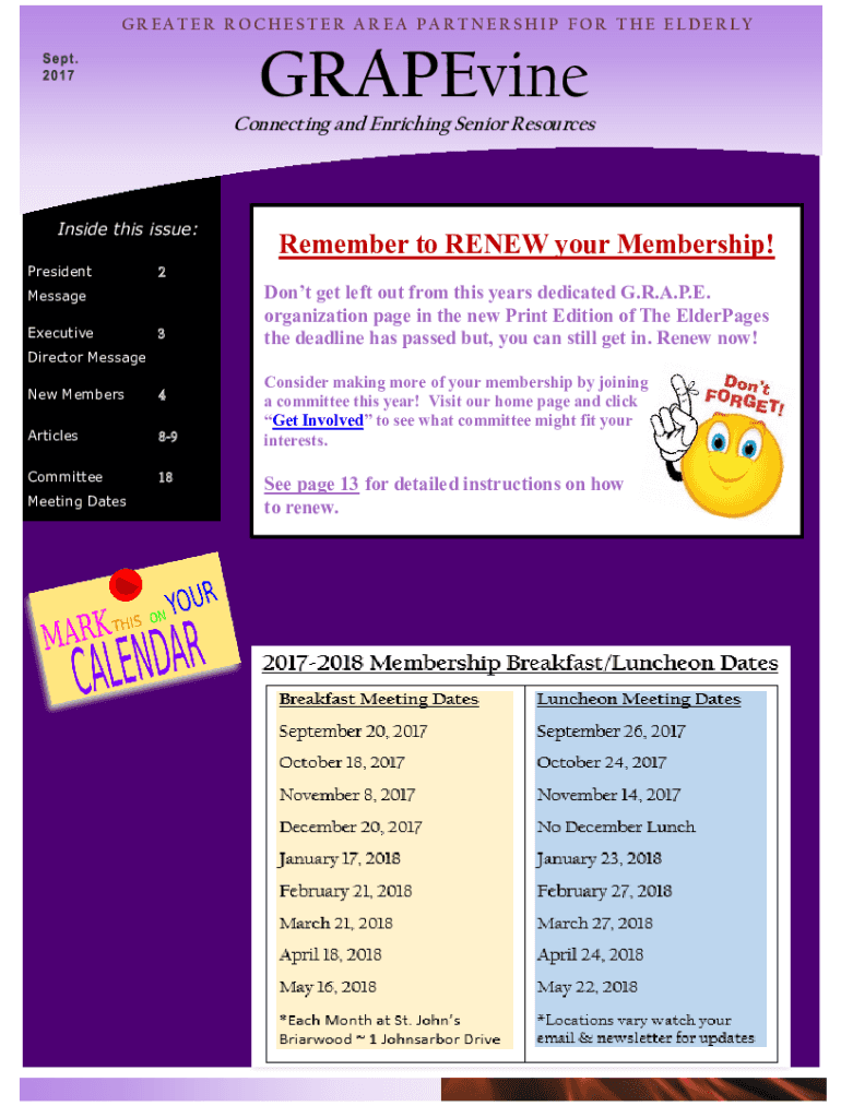 GREATER ROCHESTER AREA PARTNERSHIP FOR THE ELDERLYGRAPEvine Connecting and Enriching Senior ResourcesInside this issue: President2Message Executive3Director Message New Members4Articles89Committee18Meeting