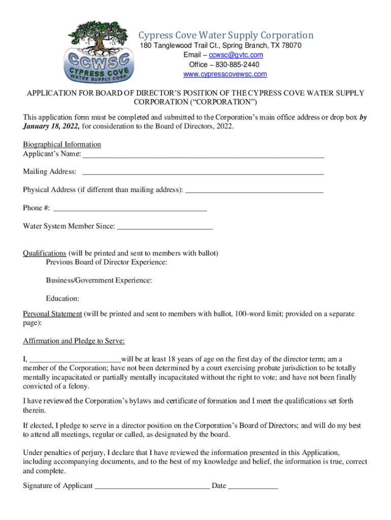 Cypress Cove Water Supply Corporation 180 Tangle wood Trail Ct., Spring Branch, TX 78070 Email ccwsc@gvtc.com Office 8308852440 www.cypresscovewsc.comAPPLICATION FOR BOARD OF DIRECTORS POSITION OF