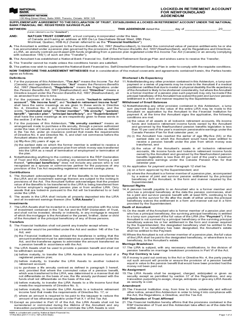LOCKED IN RETIREMENT ACCOUNT FOR NEWFOUNDLAND ADDENDUM130 King Street West, Suite 3000, Toronto, Ontario M5X 1J9SUPPLEMENTARY AGREEMENT TO THE DECLARATION OF TRUST, ESTABLISHING A LOCKED IN RETIREMENT