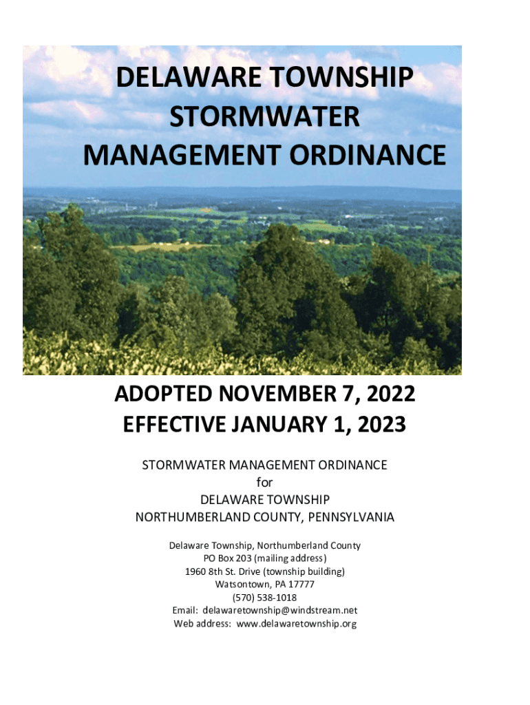 DELAWARE TOWNSHIP STORMWATER MANAGEMENT ORDINANCEADOPTED NOVEMBER 7, 2022, EFFECTIVE JANUARY 1, 2023, STORMWATER MANAGEMENT ORDINANCE for DELAWARE TOWNSHIP NORTHUMBERLAND COUNTY, PENNSYLVANIA Delaware