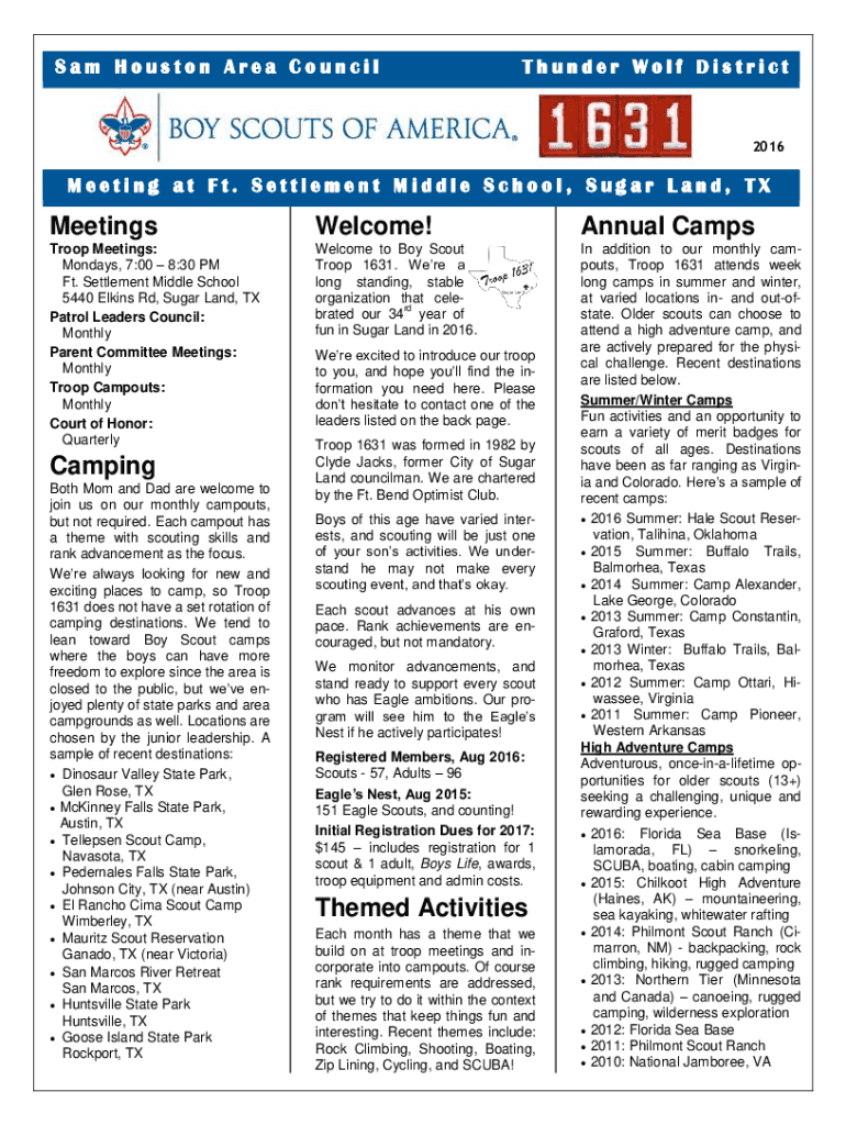 Sam Houston Area CouncilThunder Wolf District2016Meeting at Ft. Settlement Middle School, Sugar Land, TXMeetingsWelcome! Annual CampsTroop Meetings: Mondays, 7:00 8:30 PM Ft. Settlement Middle School
