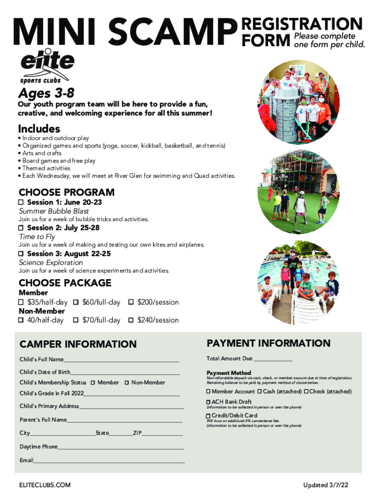 MINI SCAMPREGISTRATION complete FORM Please one form per child. Ages 38Our youth program team will be here to provide a fun, creative, and welcoming experience for all this summer! Includes Indoor