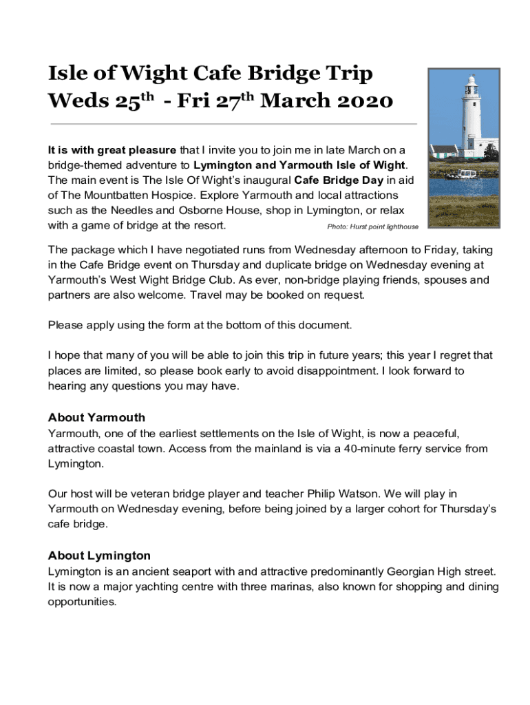 Isle of Wight Café Bridge Trip Weds 25th Fri 27th March 2020 It is with great pleasure that I invite you to join me in late March on a bridge themed adventure to Lexington and Yarmouth Isle of Wight.