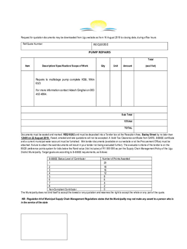 Request for quotation documents may be downloaded from UGU website as from 16 August 2019 to closing date, during office hours Ref/Quote Number:REQ10202 PUMP REPAIRS TotalItemDescription/ Specification/