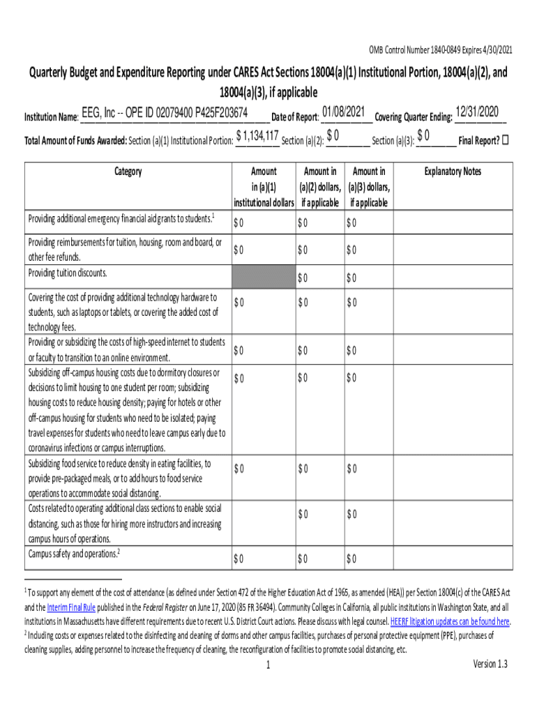 QuarterlyBudgetandExpenditureReportingunderCARESActSections18004(a)(1)Institutionalization,18004(a)(2), and