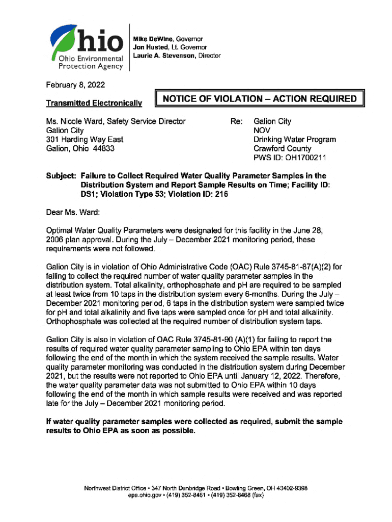 Mike DeWine, Governor Jon Hosted, Lt. Governor Laurie A. Stevenson, Director February 8, 2022, Transmitted ElectronicallyNOTICE OF VIOLATION ACTION REQUIRED Ms. Nicole Ward, Safety Service Director