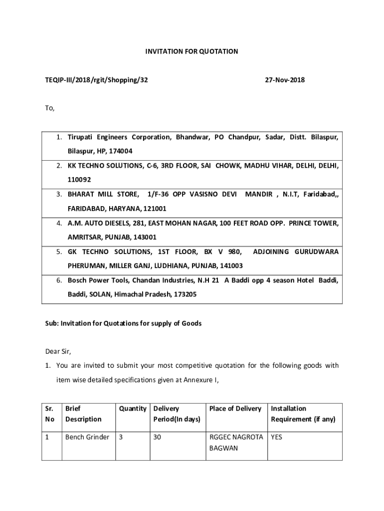 INVITATION FOR QUOTATIONTEQIPIII/2018/grit/Shopping/3227Nov2018To,1. Timpani Engineers Corporation, Handcar, PO Chandler, Radar, Dist. Blaster,