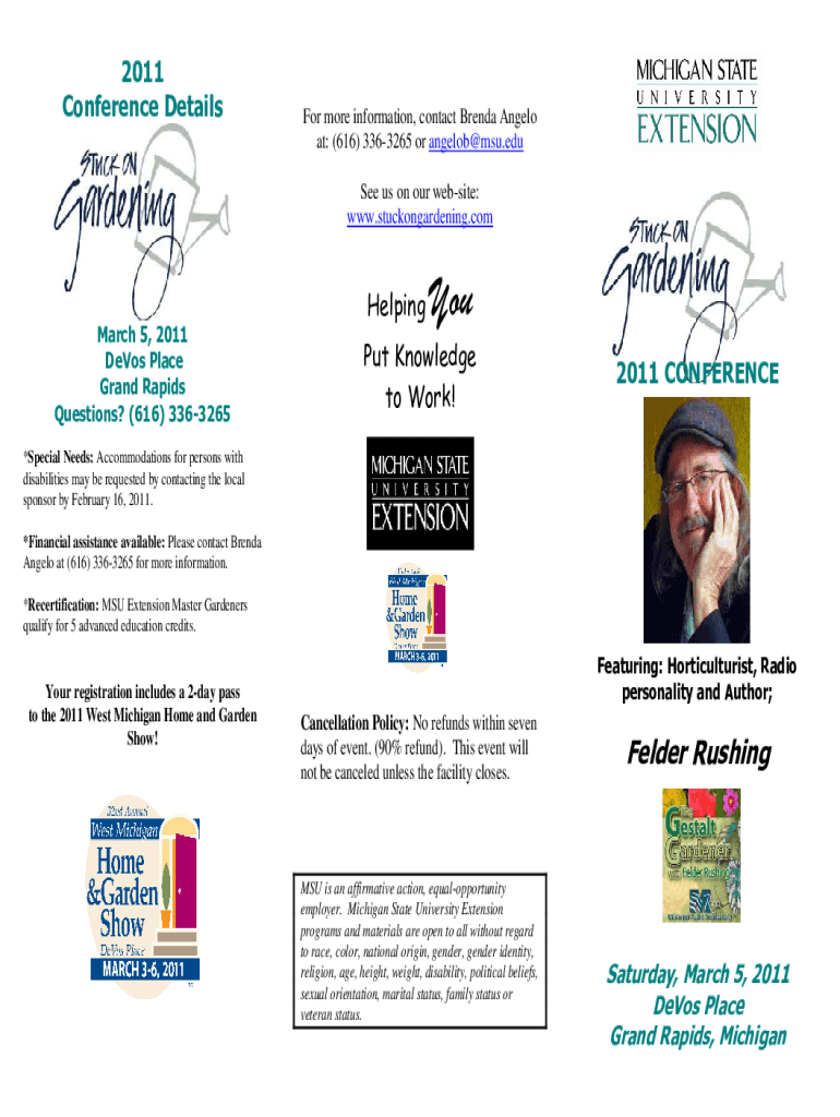 2011 Conference Details more information, contact Brenda Angelo at: (616) 3363265 or angelob@msu.edu See us on our website: www.stuckongardening.comHelping March 5, 2011, DeVos Place Grand Rapids