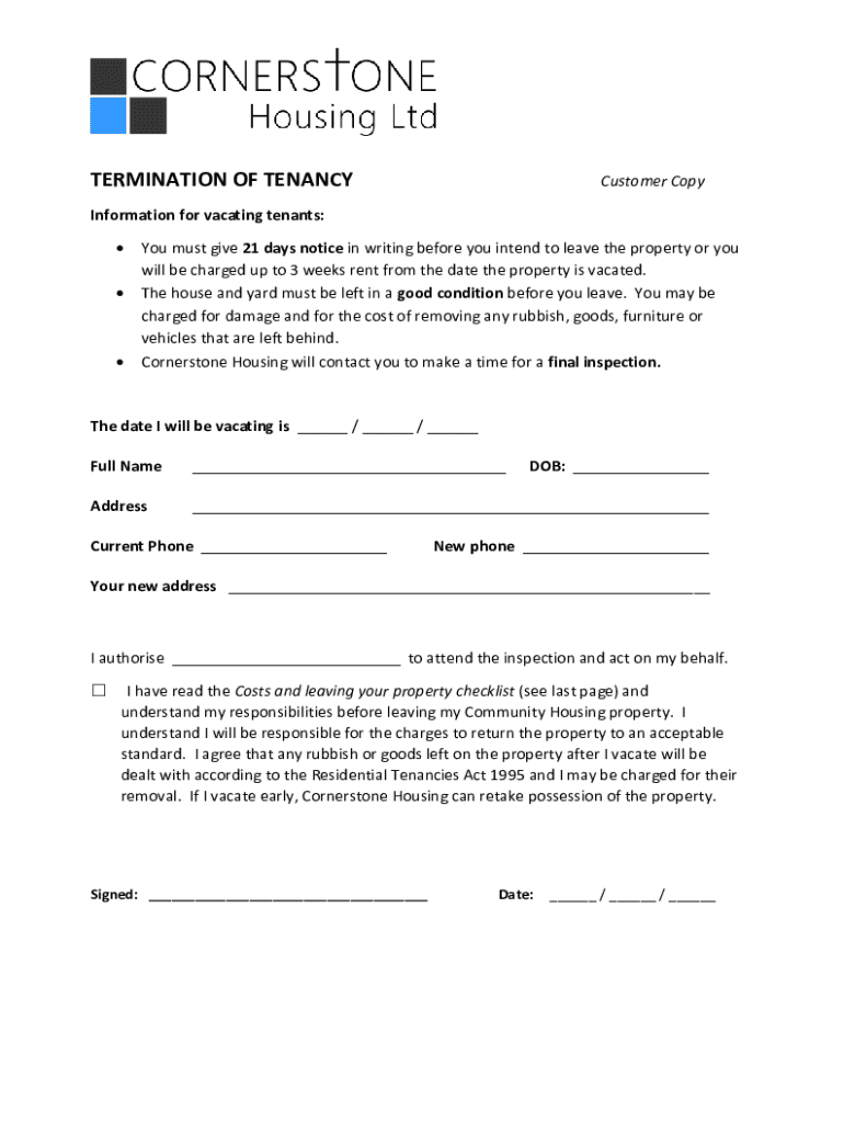 Get the free TERMINATION OF TENANCY - Cornerstone Housing