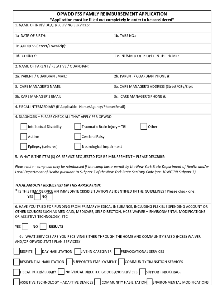 ODD FSS FAMILY REIMBURSEMENT APPLICATION×Application must be filled out completely in order to be considered×1. NAME OF INDIVIDUAL RECEIVING SERVICES: 1a DATE OF BIRTH:1b. TABS NO.:1c. ADDRESS (Street/Town/Zip):