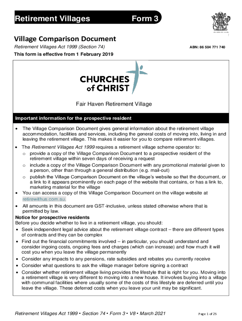Retirement VillagesForm 3Village Comparison Document Retirement Villages Act 1999 (Section 74)ABN: 86 504 771 740This form is effective from 1 February 2019Fair Haven Retirement Village Important