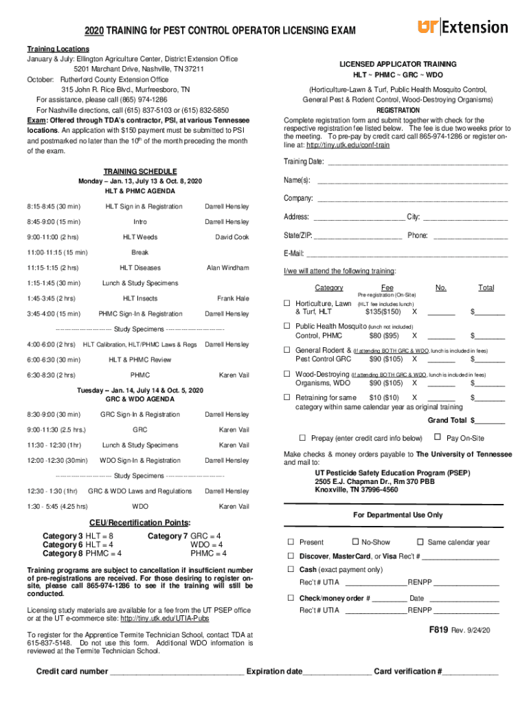 2020 TRAINING for PEST CONTROL OPERATOR LICENSING EXAM Training Locations January & July: Ellington Agriculture Center, District Extension Office 5201 Merchant Drive, Nashville, TN 37211 October: