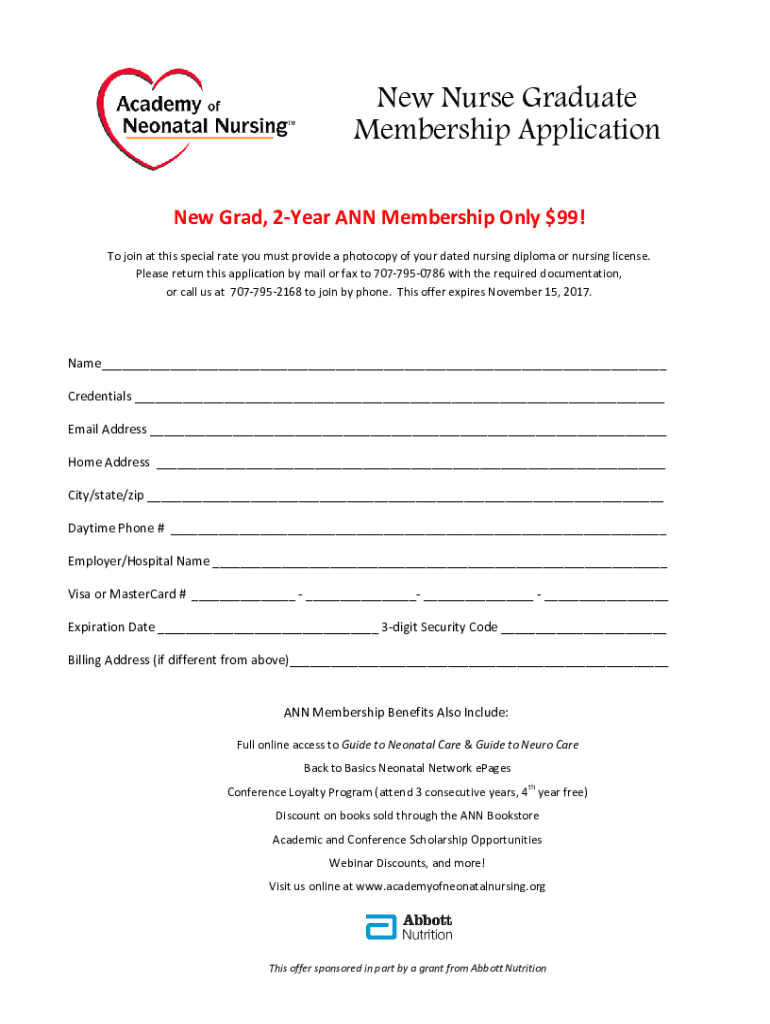 New Nurse Graduate Membership Application New Grad, 2Year ANN Membership Only $99! To join at this special rate you must provide a photocopy of your dated nursing diploma or nursing license. Please
