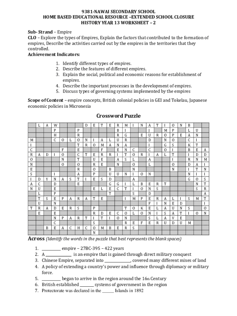 9381NAWAI SECONDARY SCHOOL HOME BASED EDUCATIONAL RESOURCE EXTENDED SCHOOL CLOSURE HISTORY YEAR 13 WORKSHEET 2 Sub Strand Empire CIO Explores the types of Empires, Explain the factors that contributed