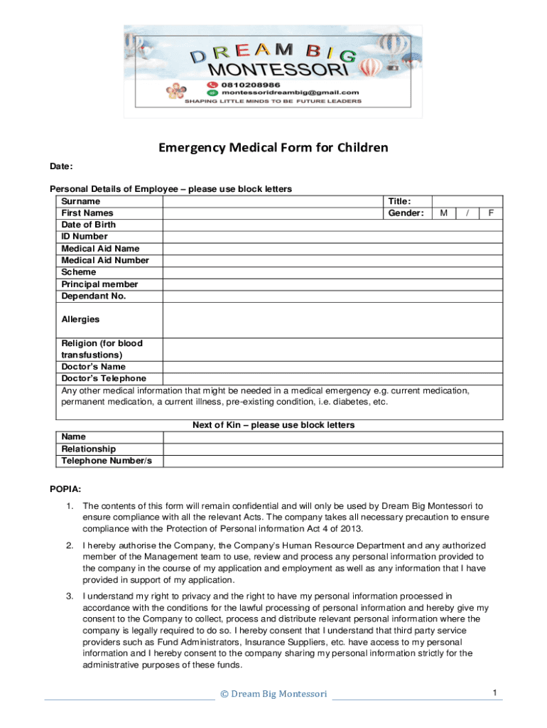 Get the free Emergency Medical Form for Children