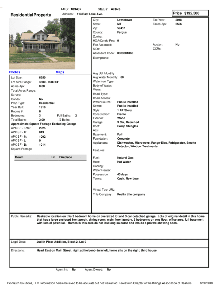 New noise medals: 103407 Address:ResidentialPropertyStatus: Active113 East Lake Ave. City: State: Zip: County: Zoning: HOA/Condo Fee: Fee Assessed: SID's: Assessors Code:Lewiston MT 59457 Ferguson