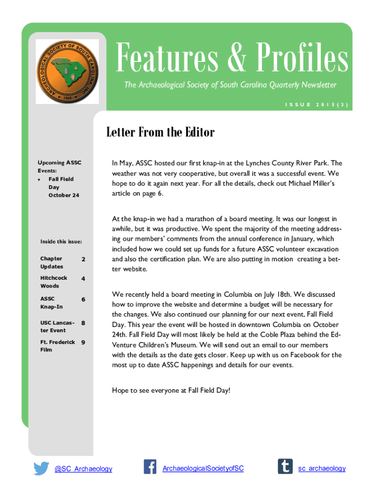 Features & Profiles The Archaeological Society of South Carolina Quarterly Newsletter E WI SS LS EU TET E2 R0 1D5 A(T 3 E)Letter From the Editor Upcoming ASSR Events: Fall Field Day October 24Inside