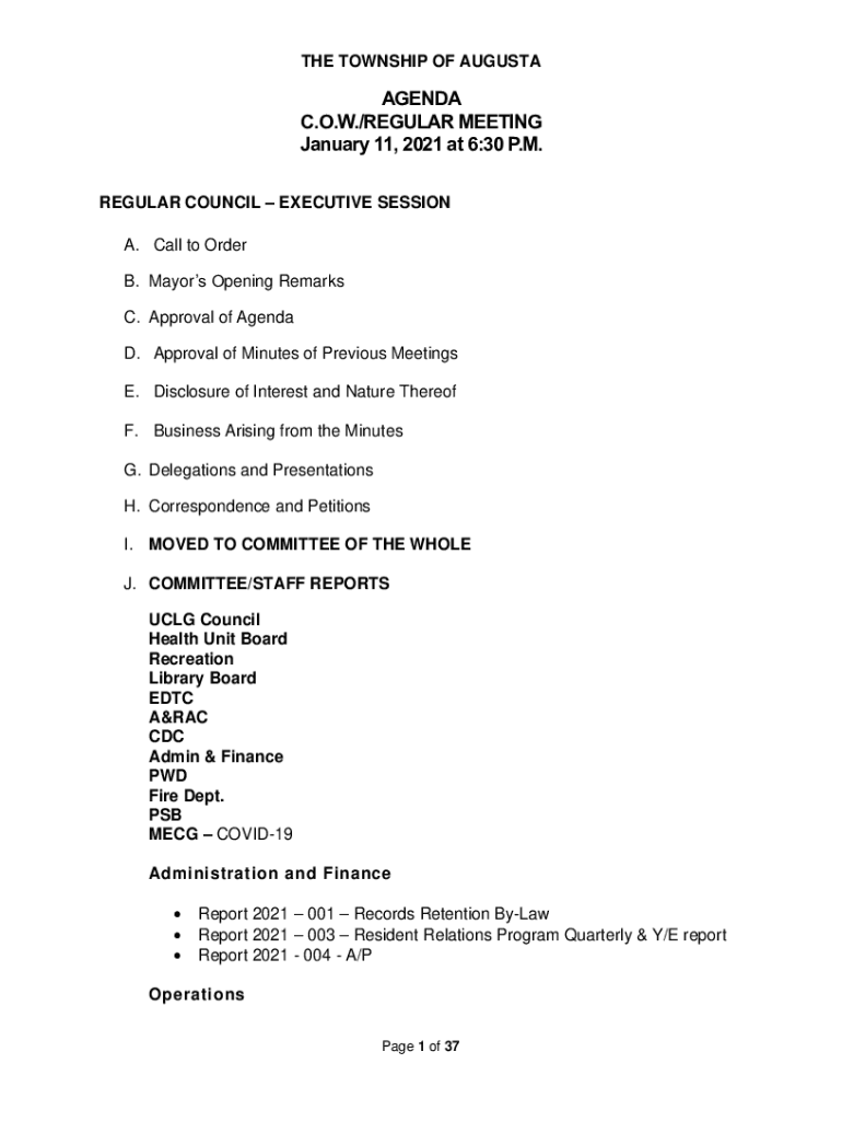 THE TOWNSHIP OF AUGUSTAAGENDA C.O.W./REGULAR MEETING January 11, 2021, at 6:30 P.M. REGULAR COUNCIL EXECUTIVE SESSION A. Call to Order B. Mayors Opening Remarks C. Approval of Agenda D. Approval of