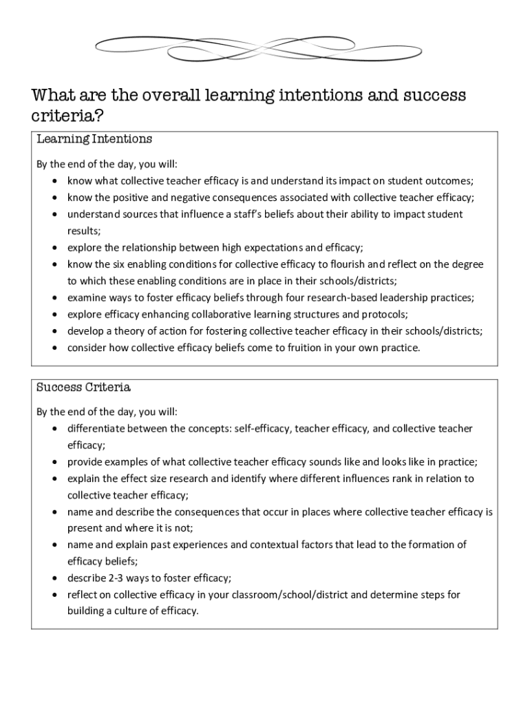 What are the overall learning intentions and success criteria? Learning Intentions By the end of the day, you will: know what collective teacher efficacy is and understand its impact on student outcomes;