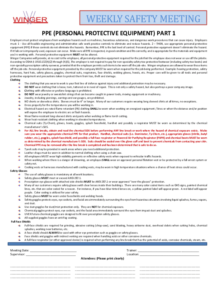 WEEKLY SAFETY MEETING PPE (PERSONAL PROTECTIVE EQUIPMENT) PART 1 Employers must protect employees from workplace hazards such as machines, hazardous substances, and dangerous work procedures that