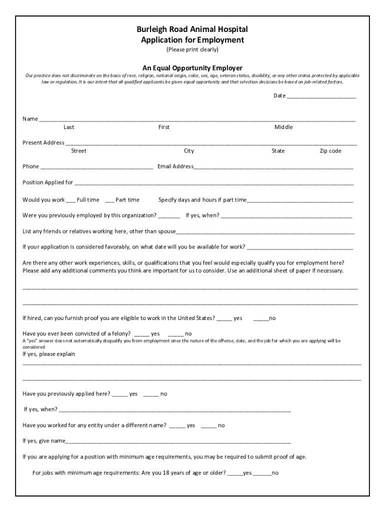 Burleigh Road Animal Hospital Application for Employment (Please print clearly)An Equal Opportunity Employer practice does not discriminate on the basis of race, religion, national origin, color,