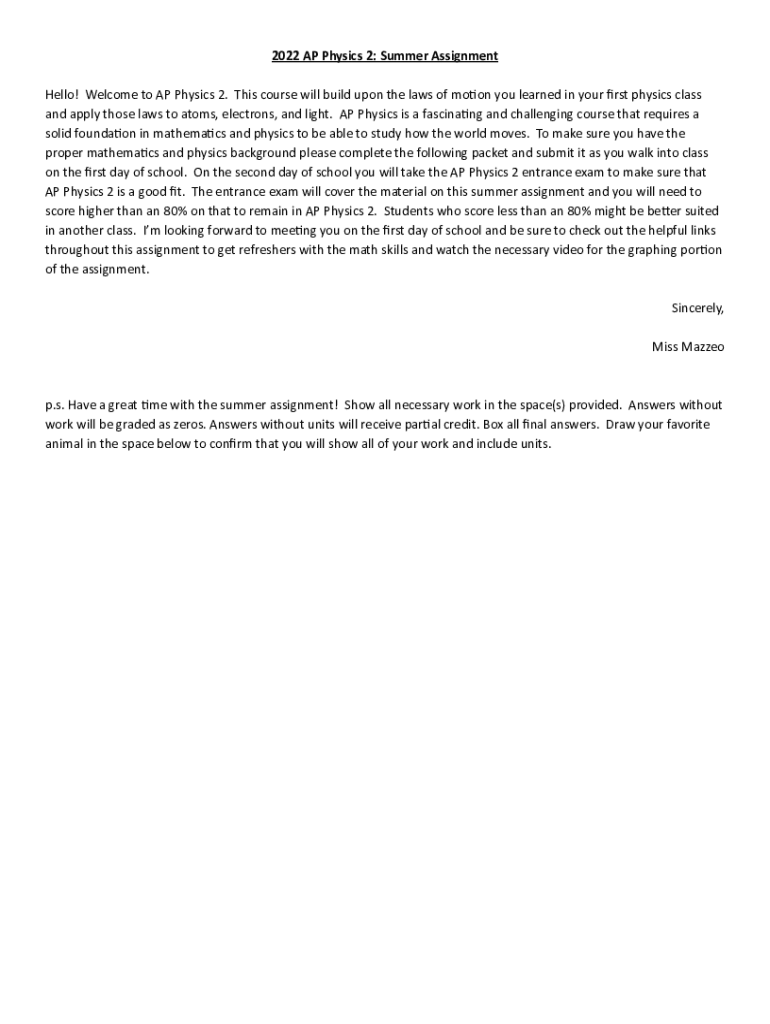 2022 AP Physics 2: Summer Assignment Hello! Welcome to AP Physics 2. This course will build upon the laws of mo on you learned in your RST physics class and apply those laws to atoms, electrons, and