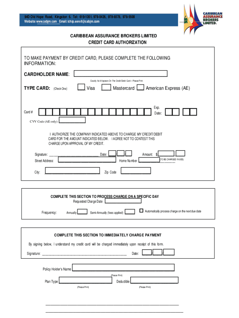 94D Old Hope Road, Kingston 6. Tel: 6191351, 9780426, 9786578, 9785508 Website: www.cabjm.com Email: ichip.enroll@cabjm.comCARIBBEAN ASSURANCE BROKERS LIMITEDCREDIT CARD AUTHORIZATION TO MAKE PAYMENT