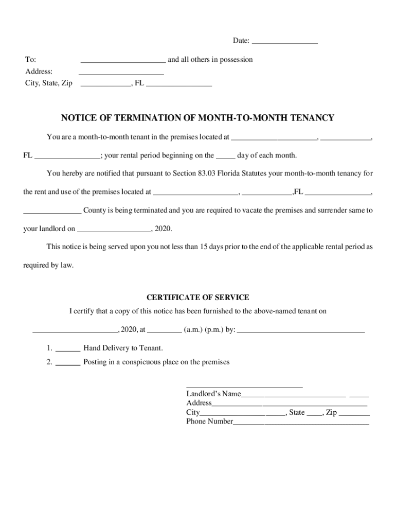 Date: ___ To: ___ and all others in possession Address: ___ City, State, Zip ___, FL ___NOTICE OF TERMINATION OF MONTHTOMONTH TENANCY You are a monthtomonth tenant in the premises located at ___,