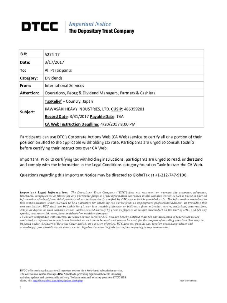 The Depository Trust Company#:527417Date:3/17/2017To:AllParticipantsCategory:DividendsFrom:InternationalServicesAttention:Operations, Reorg&DividendManagers, Partners&Cashiers