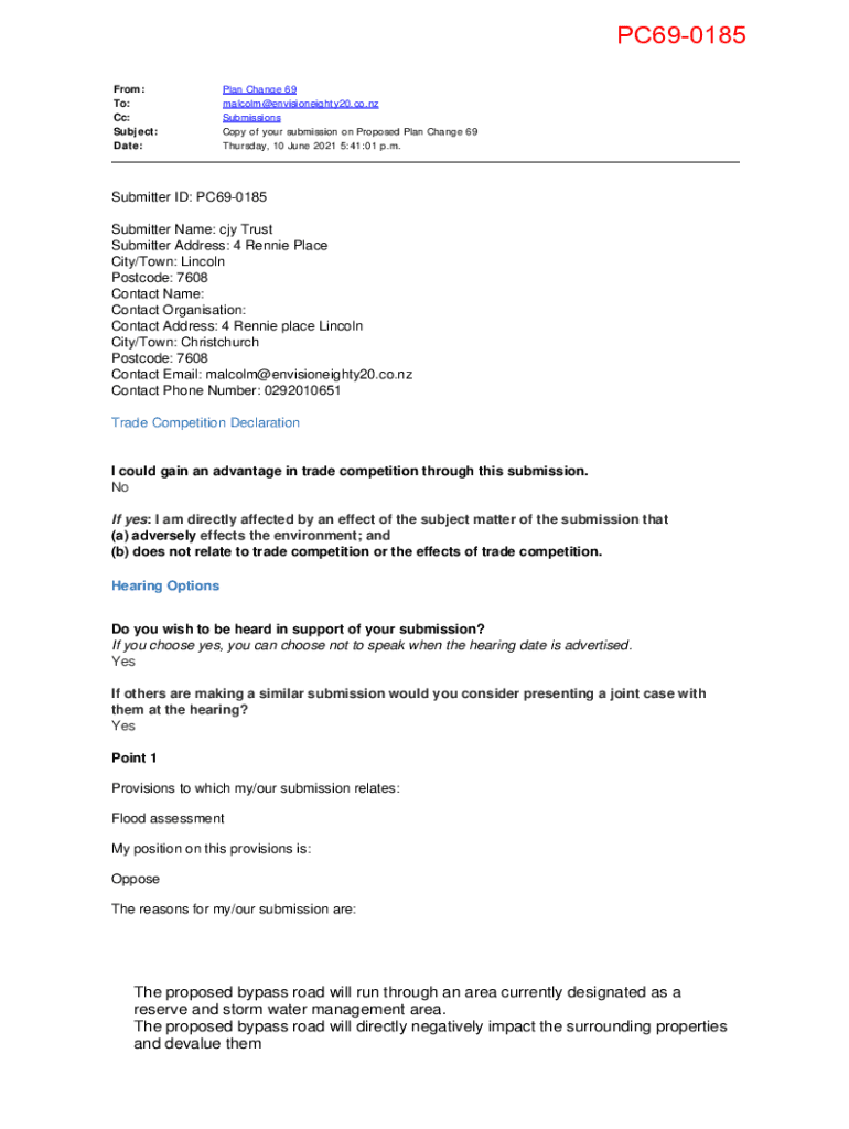PC690185 From: To: Cc: Subject: Date:Plan Change 69 malcolm@envisioneighty20.co.nz Submissions Copy of your submission on Proposed Plan Change 69 Thursday, 10 June 2021 5:41:01 p.m. Submitter ID: