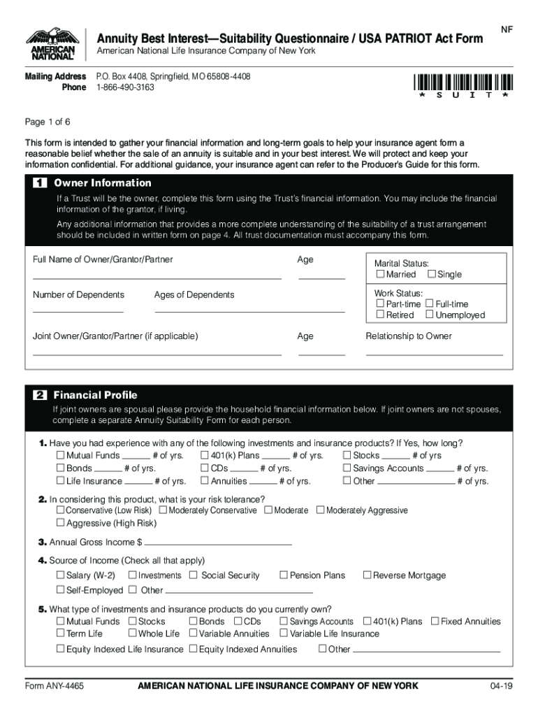 Application for Individual Annuity AMERICAN NATIONAL LIFE INSURANCE COMPANY OF NEW YORK page 1Mailing Address: Mail Processing Center, P.O. Box 4408, Springfield, MO 658084408 Business: (866) 4903163AGENT