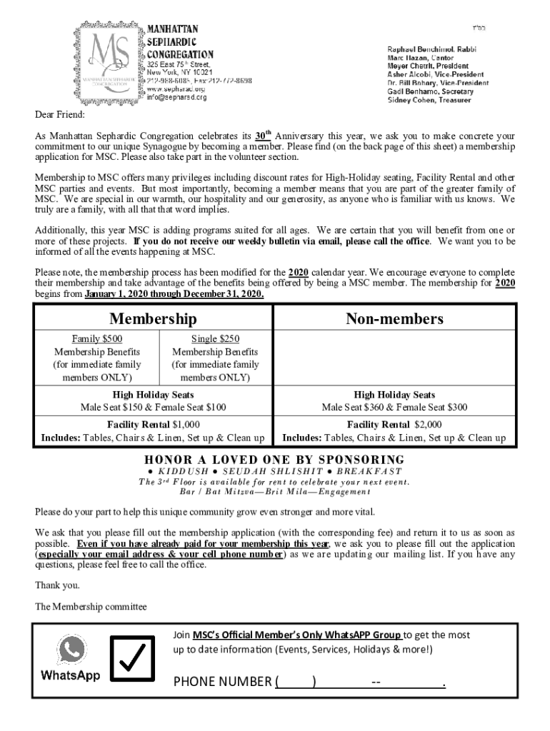 Dear Friend: As Manhattan Sephardi Congregation celebrates its 30th Anniversary this year, we ask you to make concrete your commitment to our unique Synagogue by becoming a member. Please find (on