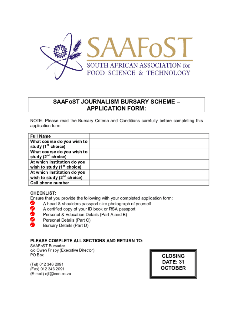 The Safest JOURNALISM BURSARY SCHEME APPLICATION FORM: NOTE: Please read the Bursary Criteria and Conditions carefully before completing this application form Full Name What course do you wish to