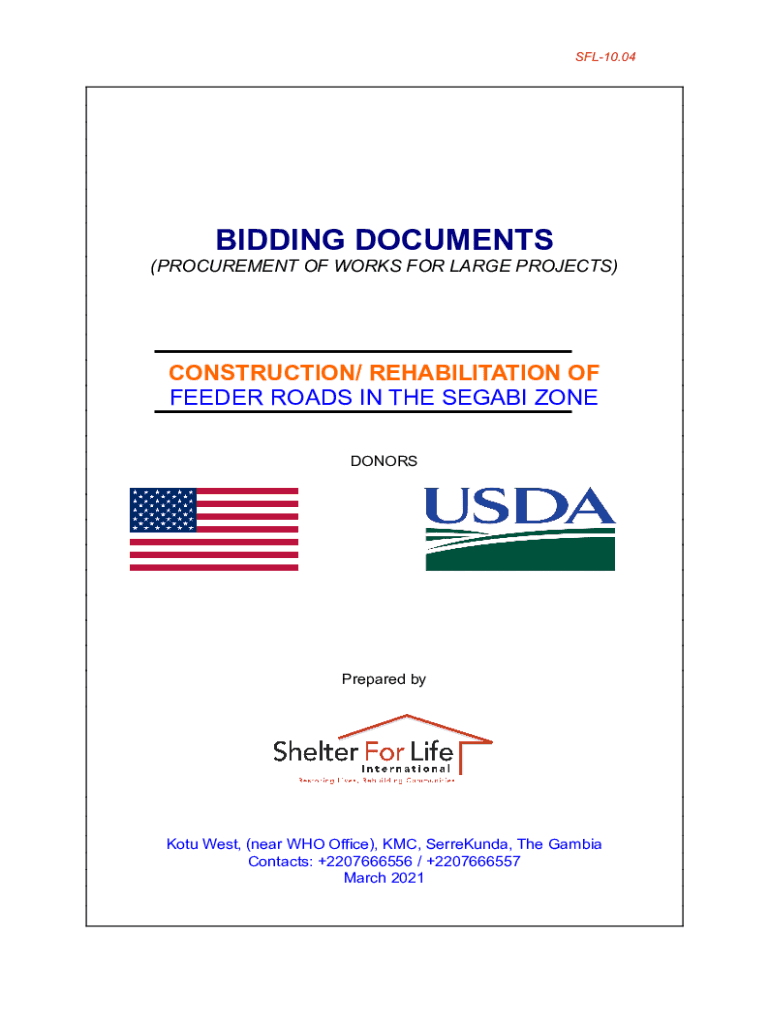 BIDDING DOCUMENTS (PROCUREMENT OF WORKS FOR LARGE PROJECTS)CONSTRUCTION/ REHABILITATION OF FEEDER ROADS IN THE SEGA ZONE DONORSPrepared you West, (near WHO Office), KM, SerreKunda, The Gambia Contacts: