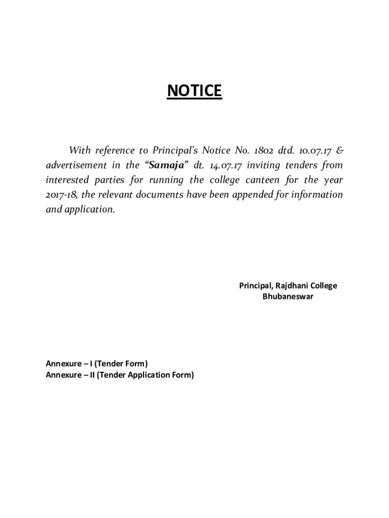 NOTICE With reference to Principals Notice No. 1802 did. 10.07.17 & advertisement in the Samara DT. 14.07.17 inviting tenders from interested parties for running the college canteen for the year 201718,