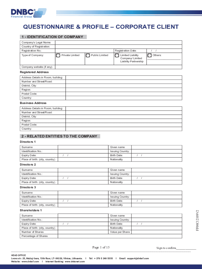 QUESTIONNAIRE & PROFILE CORPORATE CLIENT 1 IDENTIFICATION OF COMPANY\'s Legal Name: Country of Registration: Registration No.: Type of Company:Registration Date: Private Limited/Limited Liability