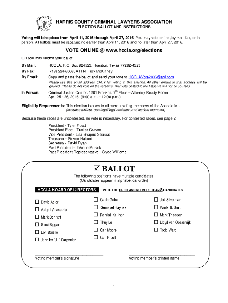HARRIS COUNTY CRIMINAL LAWYERS ASSOCIATION ELECTION BALLOT AND INSTRUCTIONS Voting will take place from April 11, 2016, through April 27, 2016. You may vote online, by mail, fax, or in person. All